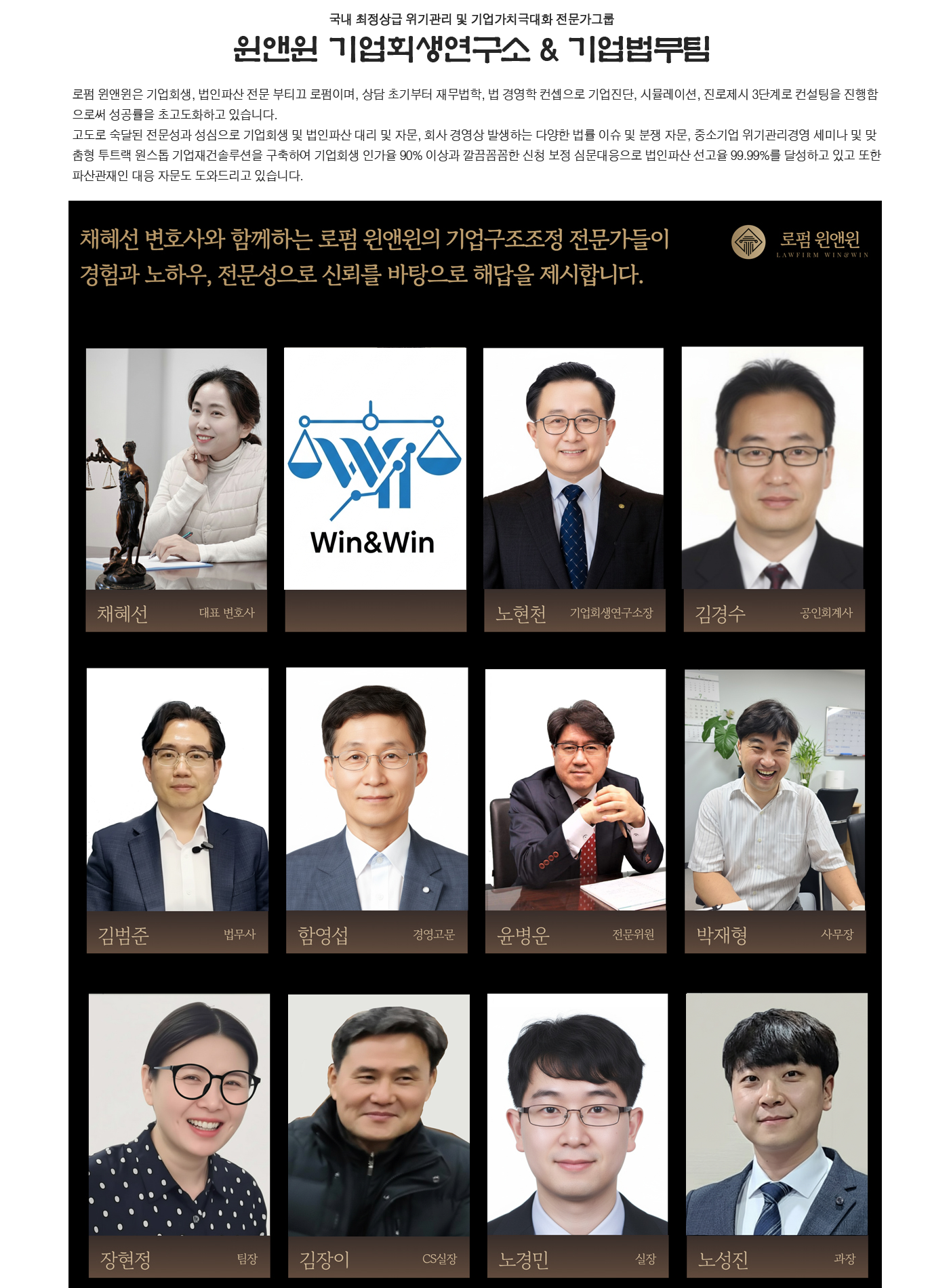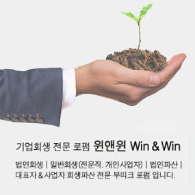 로펌 윈앤윈 | 대표자: 채혜선 | (06634) 서울특별시 서초구 서초중앙로22길 17(서초동), 메가스터디 서초오피스빌딩 2층TEL : 18111-428(전국대표), (02)588-8114, 010-6541-1145(긴급) | FAX : (02)6008-7116 | E-mail : hoisaeng@naver.com 광고책임 : 변호사 채혜선 | Copyright (c) 2023 로펌 윈앤윈 변호사 채혜선 기업회생연구소(Joseph) All Rights Reserved.